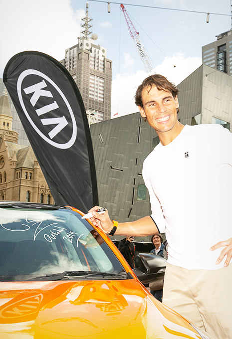 Since 2004 young Spaniard tennis sensation Rafael Nadal has been acting as a brand ambassador for Kia Motors Corporation. With this ambassadorship, Nadal and Kia have teamed up together to promote Kia's brand value of 'The Power to Surprise' to worldwide. During our partnership of Kia and this Tennis legend, he won 18 grand slams and 1 olympic gold medal.